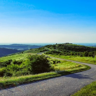 The image shows a scenic view of a long, arched railway bridge curving gracefully through a lush green landscape. A vintage-style steam train with red carriages is traveling across the bridge, releasing a plume of white smoke. The surrounding area is covered in rolling hills and dense greenery, giving the scene a picturesque and peaceful atmosphere — it looks like a popular travel or sightseeing spot, possibly in a rural or mountainous region.